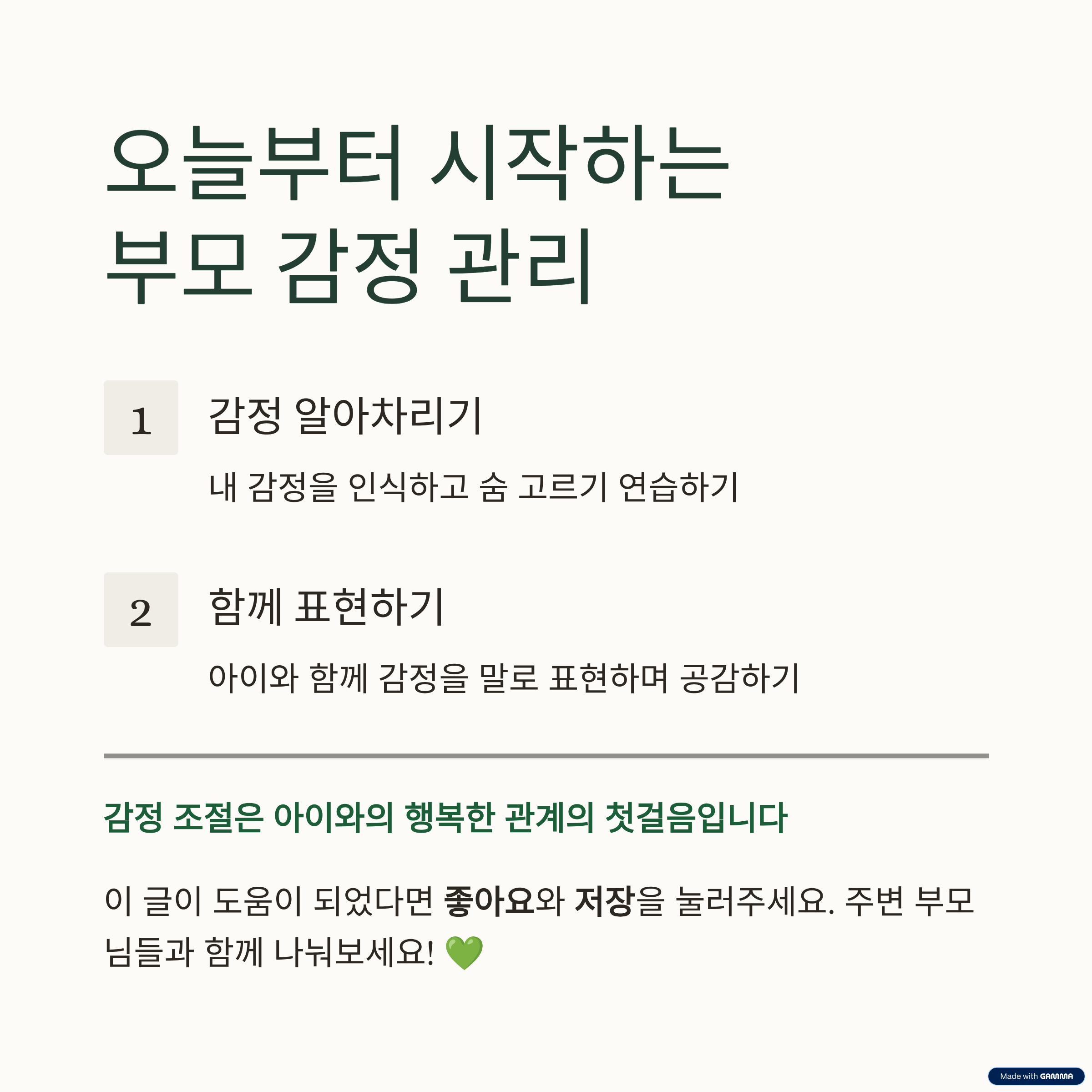 부모의 감정 관리는 아이를 통제하기 위한 수단이 아니라 관계를 안정적으로 유지하기 위한 필수 조건입니다. 감정을 조절하는 모습을 일상 속에서 보여주는 것 자체가 아이에게 가장 강력한 정서 교육이 됩니다.