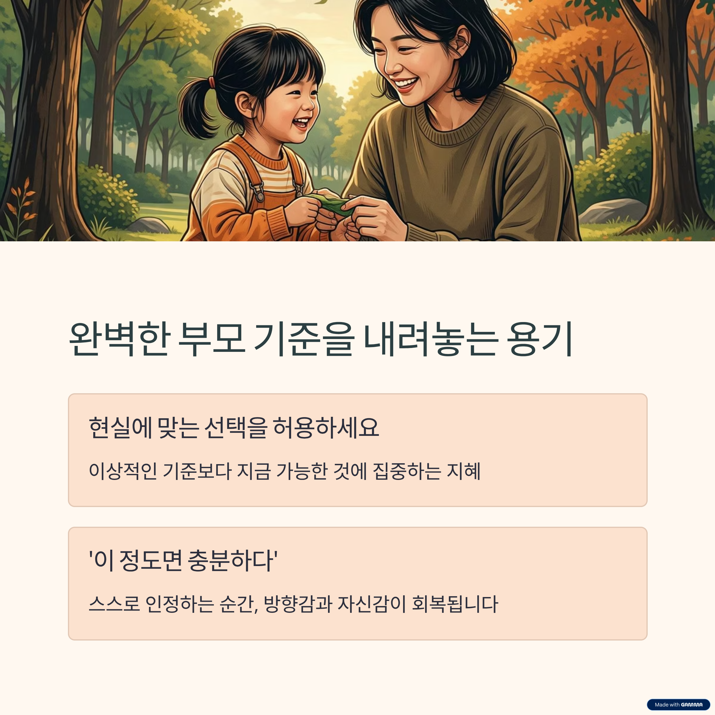 | 부모의 에너지 확인 | 기대치 조절 | 스스로 인정하기 |