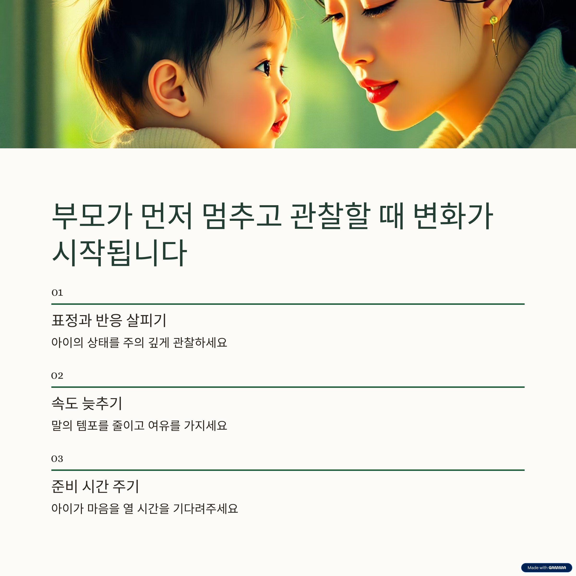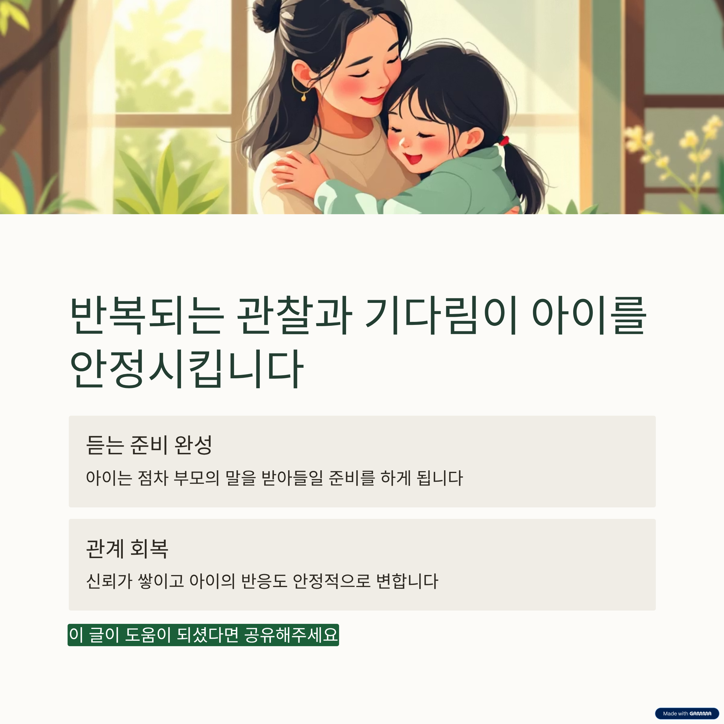 변화는 즉각적으로 나타나지 않을 수 있습니다. 그러나 반복적으로 아이의 상태를 먼저 살피는 경험이 쌓이면 아이는 점차 부모의 말을 받아들일 준비를 하게 됩니다.