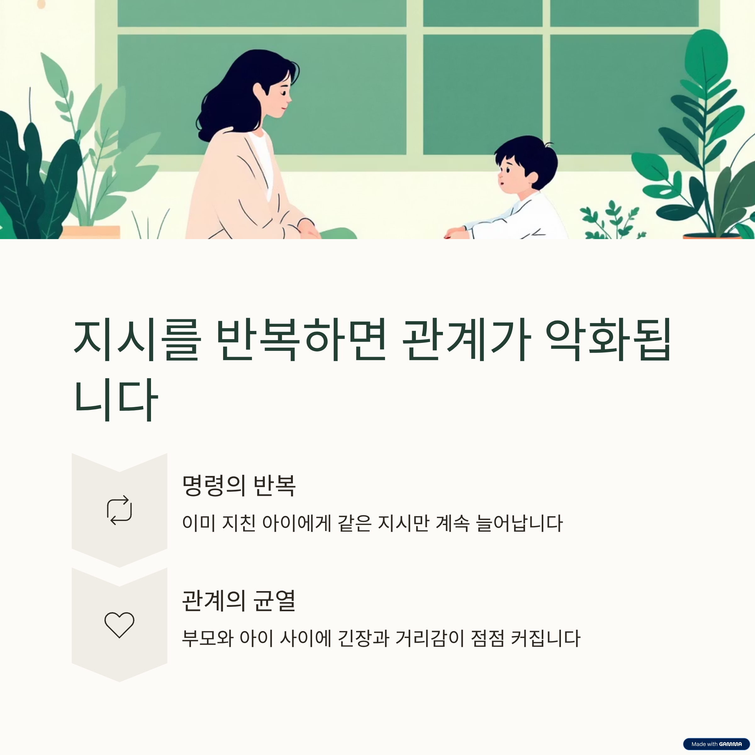 반복 지시는 아이의 집중력을 더 떨어뜨릴 수 있습니다. 이럴 때는 말을 줄이고 행동으로 안내하거나 선택지를 제시하는 방식이 더 효과적일 수 있습니다.