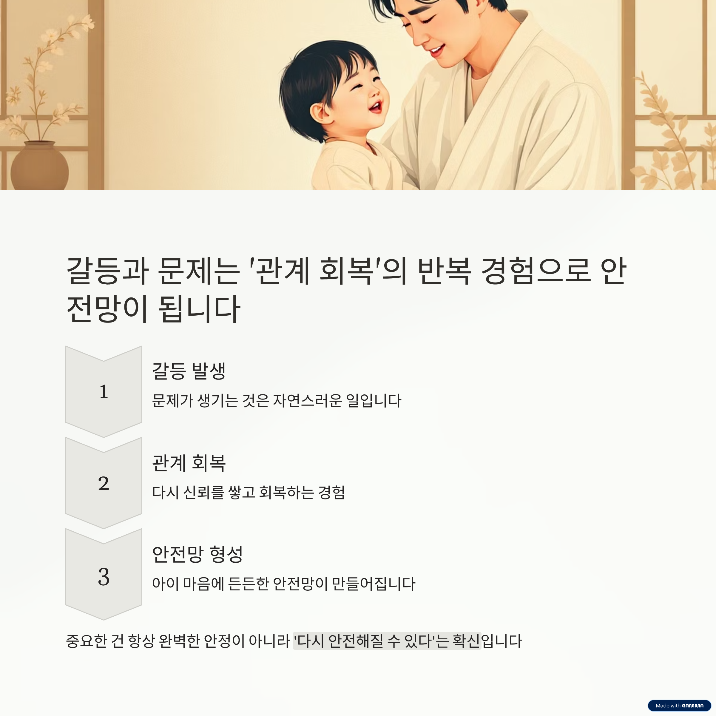 마지막으로 중요한 것은 관계 회복의 경험입니다. 갈등 이후에도 관계가 다시 안정된다는 반복 경험은 아이의 정서적 안전망을 단단하게 만들어 줍니다.