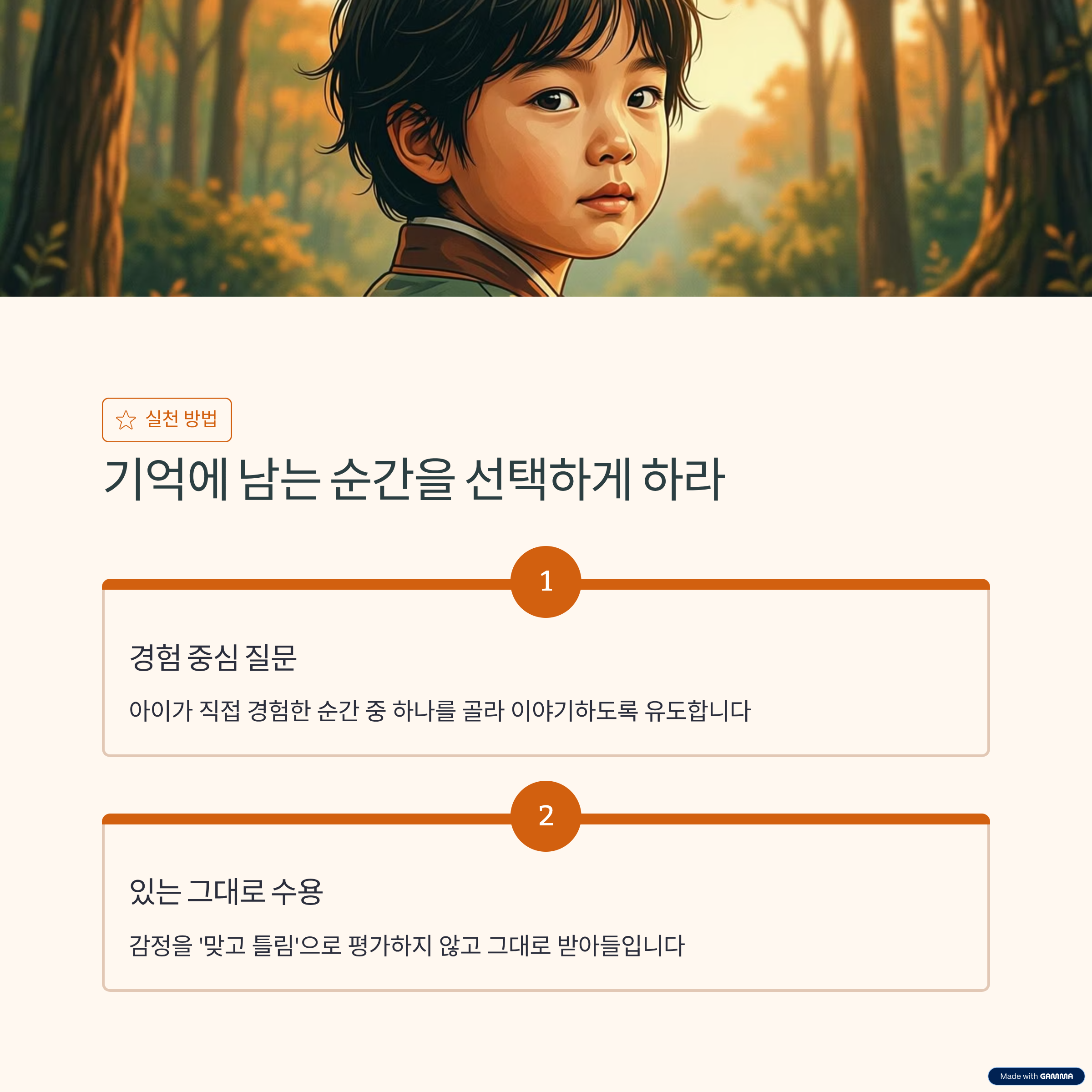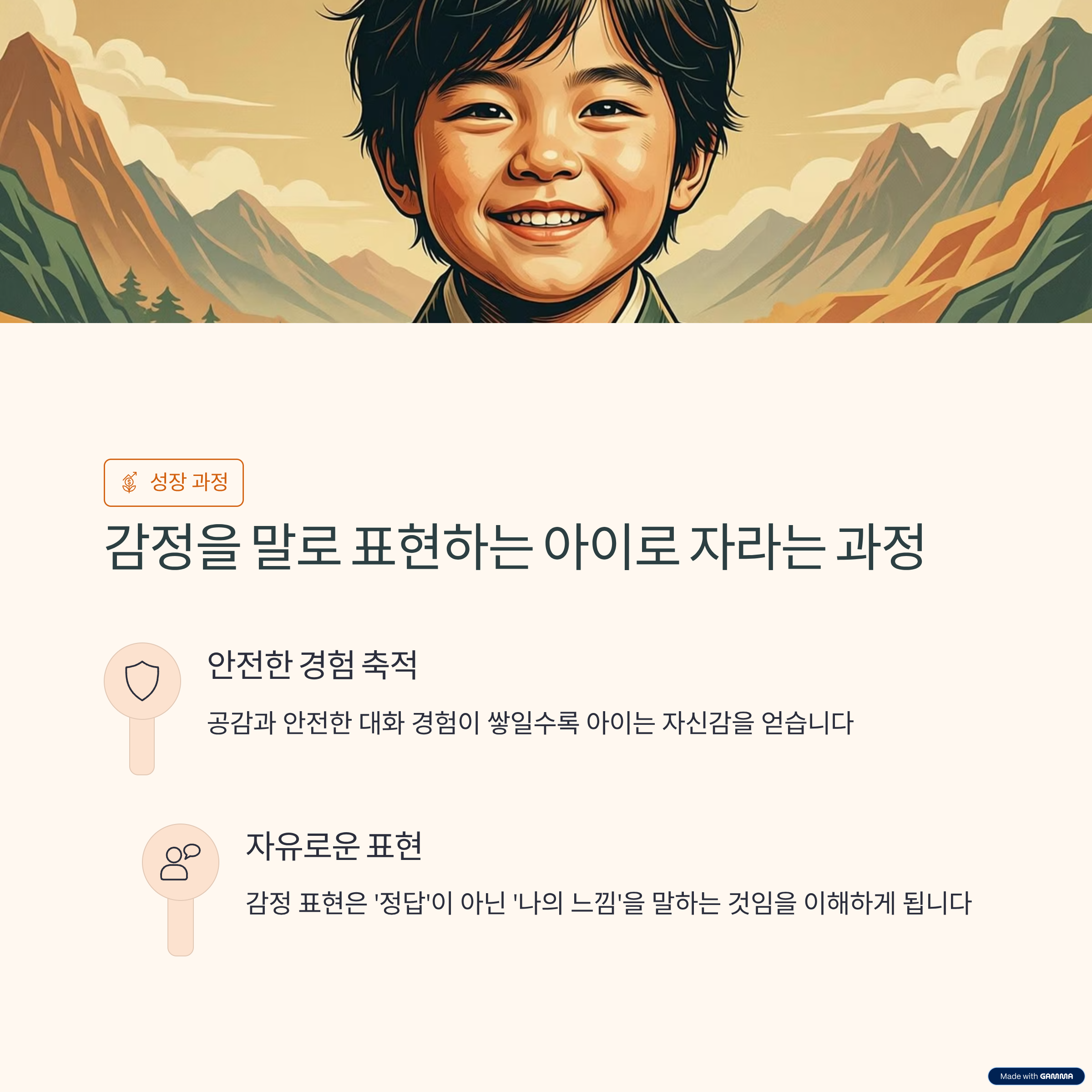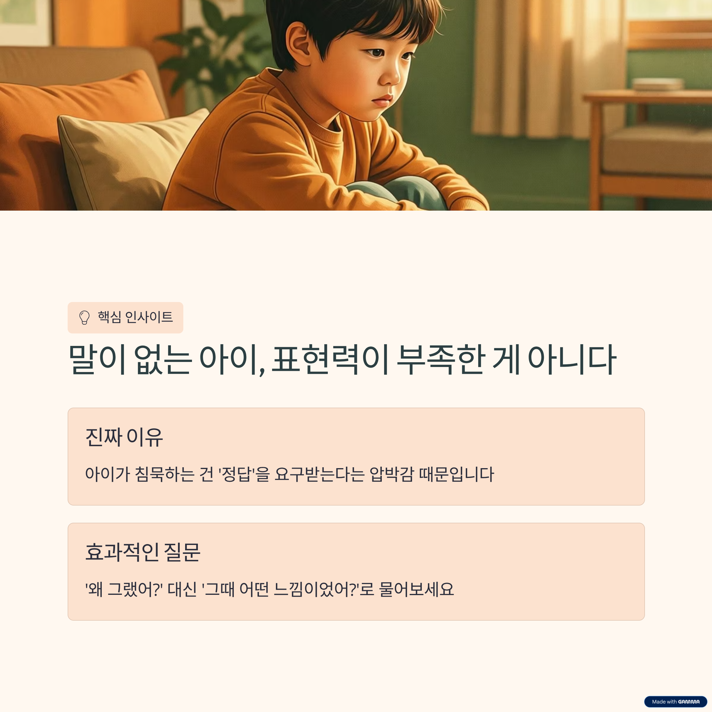 아이의 감정 표현은 한 번의 질문으로 바뀌지 않습니다. 반복되는 공감과 판단하지 않는 반응이 쌓일 때 아이는 자신의 감정을 말로 표현해도 안전하다는 확신을 갖게 됩니다.