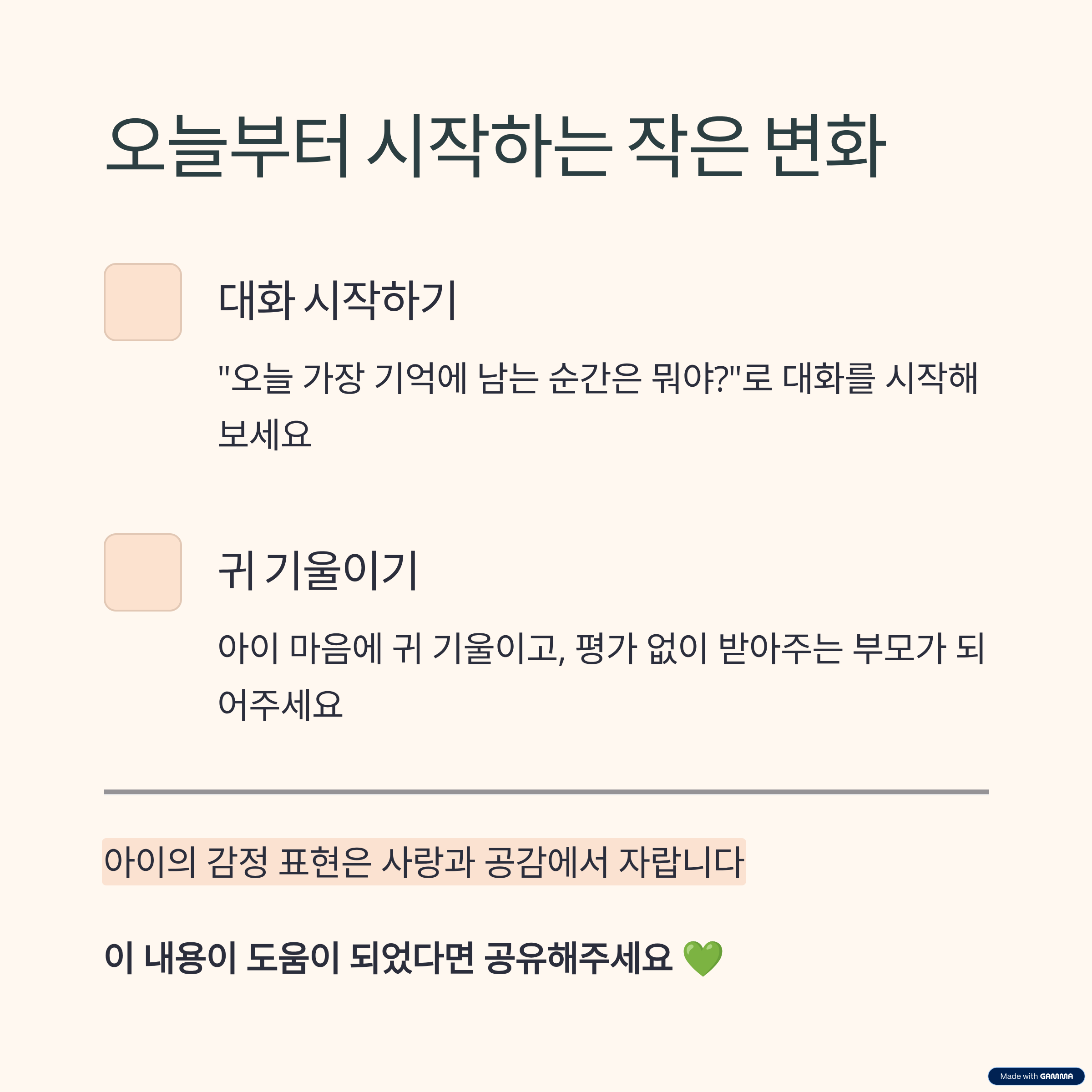 | 느낌 중심 질문 | 아이 말 반복해 주기 | 감정 언어 축적 |