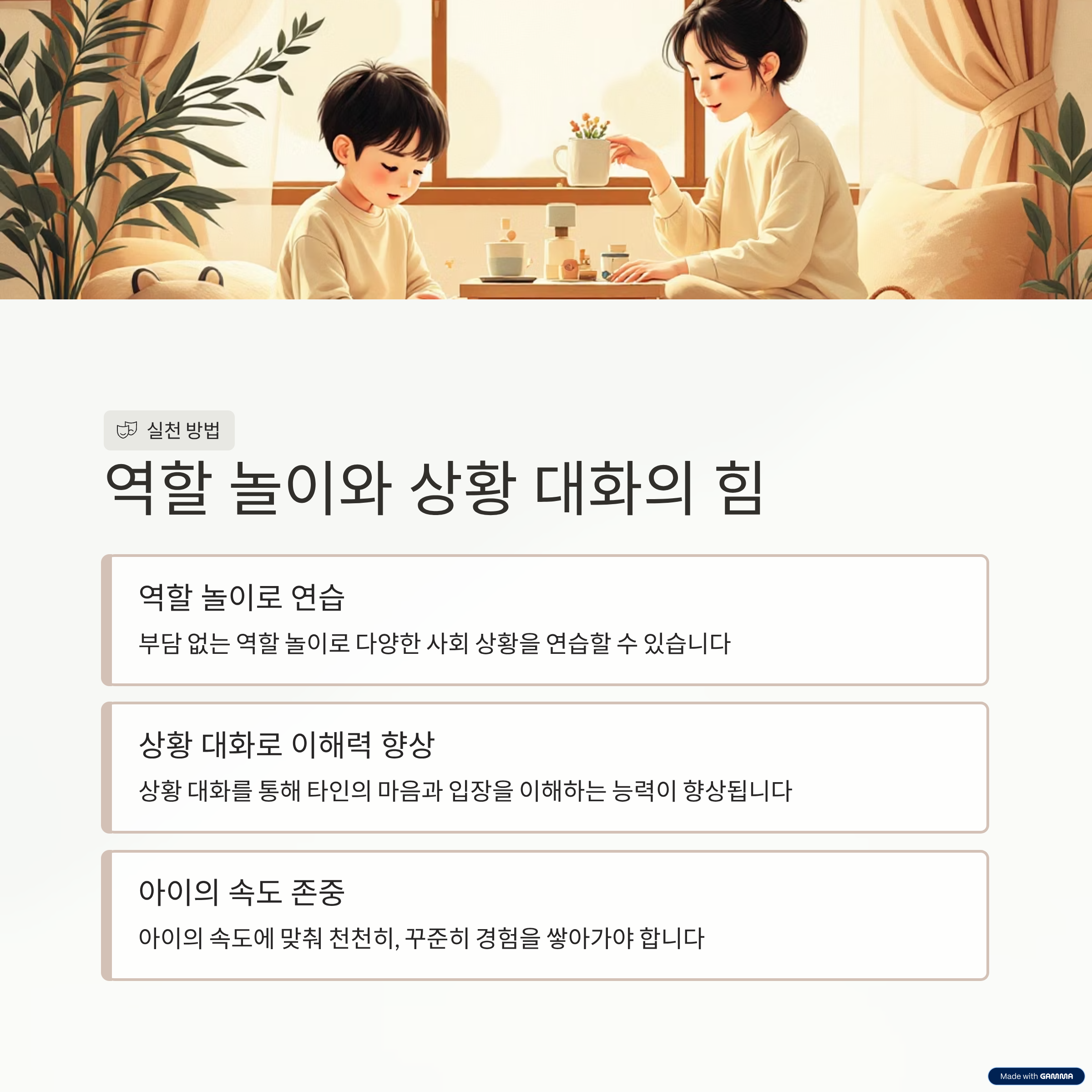 | 가정 연습 | 부담 없이 반복 가능한 사회성 준비 과정 |