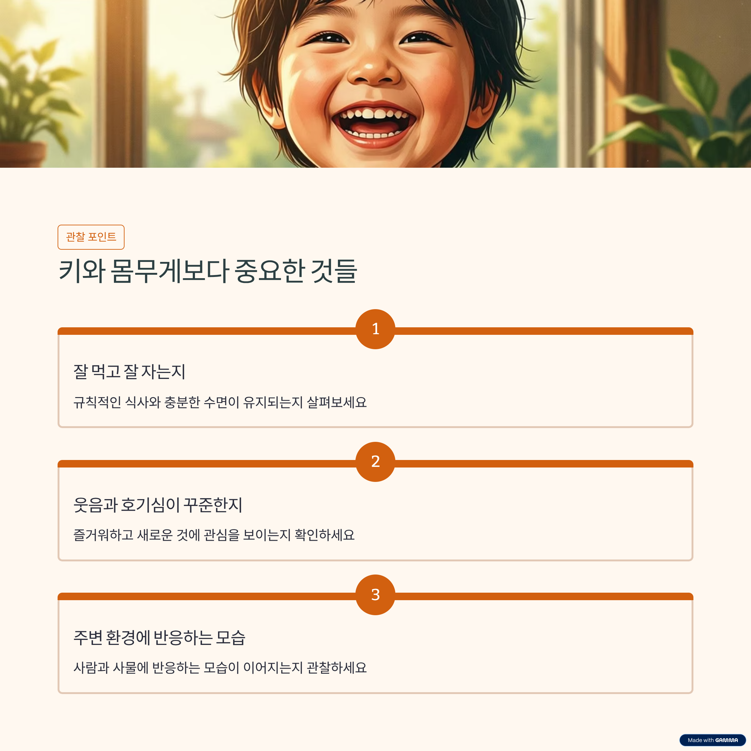 성장은 신체뿐 아니라 정서와 행동, 인지 영역이 서로 영향을 주며 진행됩니다. 키나 체중만으로 판단하기보다 놀이 방식, 소통 반응, 환경에 대한 흥미를 함께 살펴보는 것이 훨씬 정확한 관찰 방법입니다. 부모의 불안이 줄어들수록 아이의 긴장 또한 자연스럽게 완화됩니다.