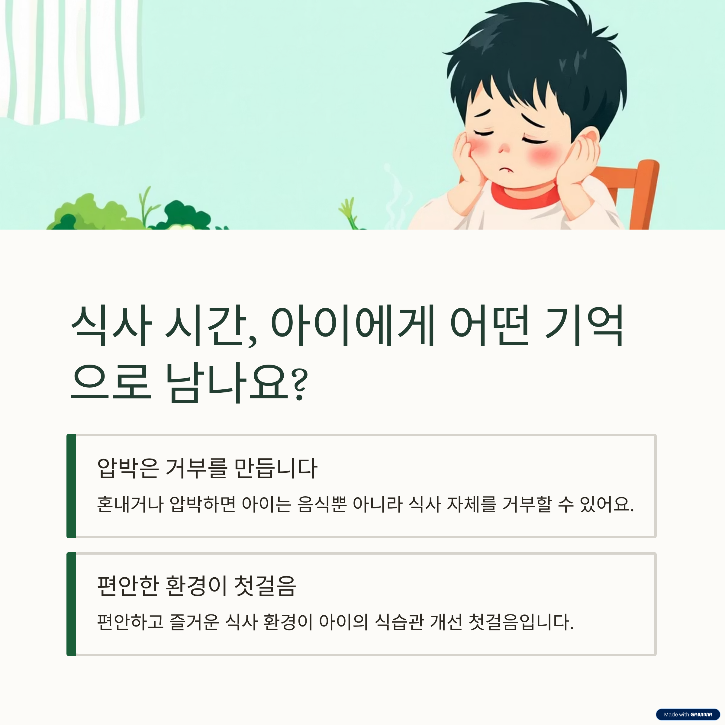 식습관의 변화는 단기간에 눈에 띄지 않습니다. 그러나 편안한 식사 경험이 누적되면서 어느 순간 아이의 선택 폭이 넓어졌음을 발견하게 됩니다.