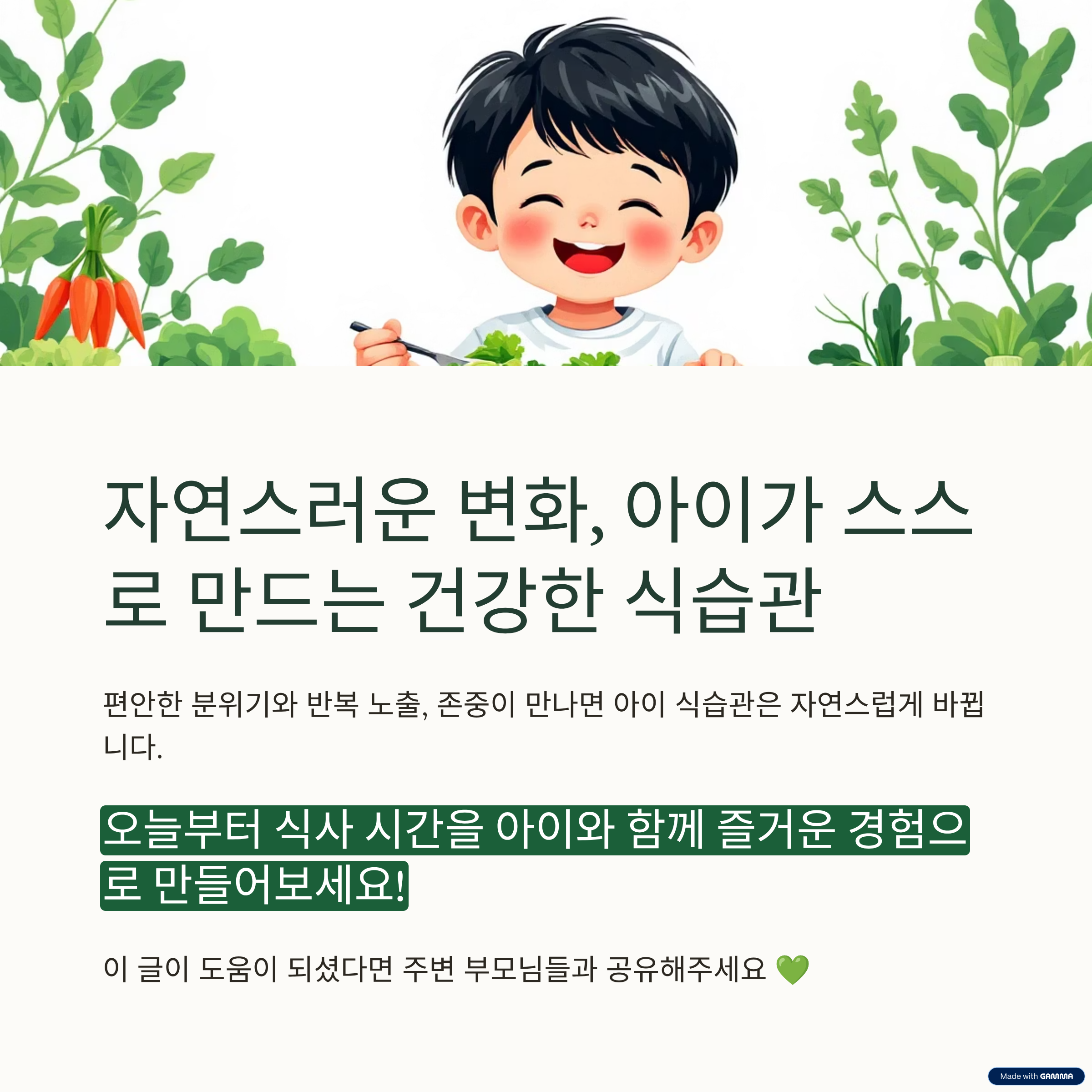 식습관 변화의 핵심은 아이가 스스로 선택하고 시도해 볼 수 있는 기회를 제공하는 것입니다. 먹는 양보다 도전하는 경험을 긍정적으로 바라보는 태도가 장기적인 변화를 만듭니다.