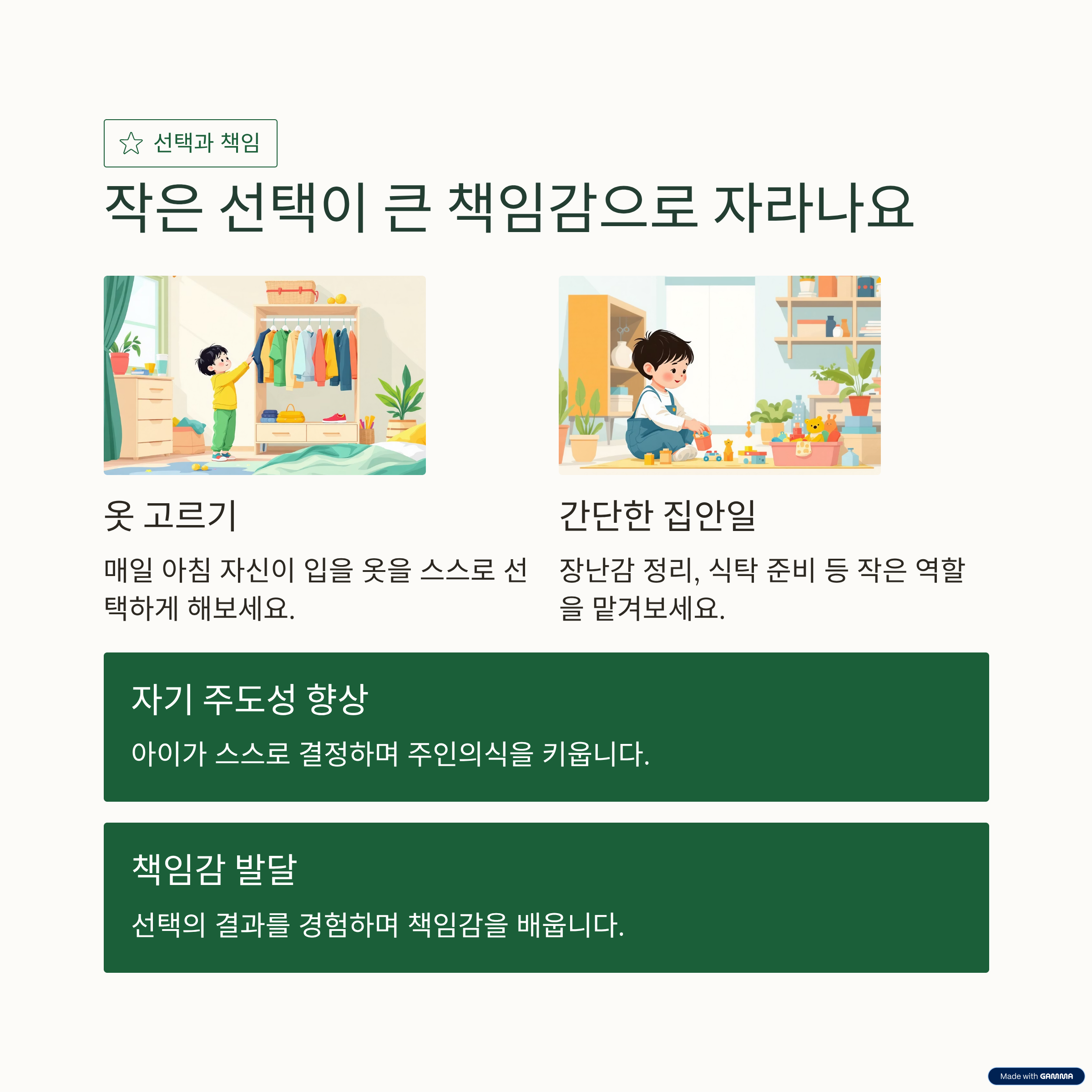 또한 아이가 선택할 수 있는 작은 결정권을 일상 속에 포함시키는 것이 중요합니다. 옷의 색을 고르거나 간식 시간을 정하는 사소한 선택 경험이 책임감과 자기 주도성을 함께 키워줍니다.