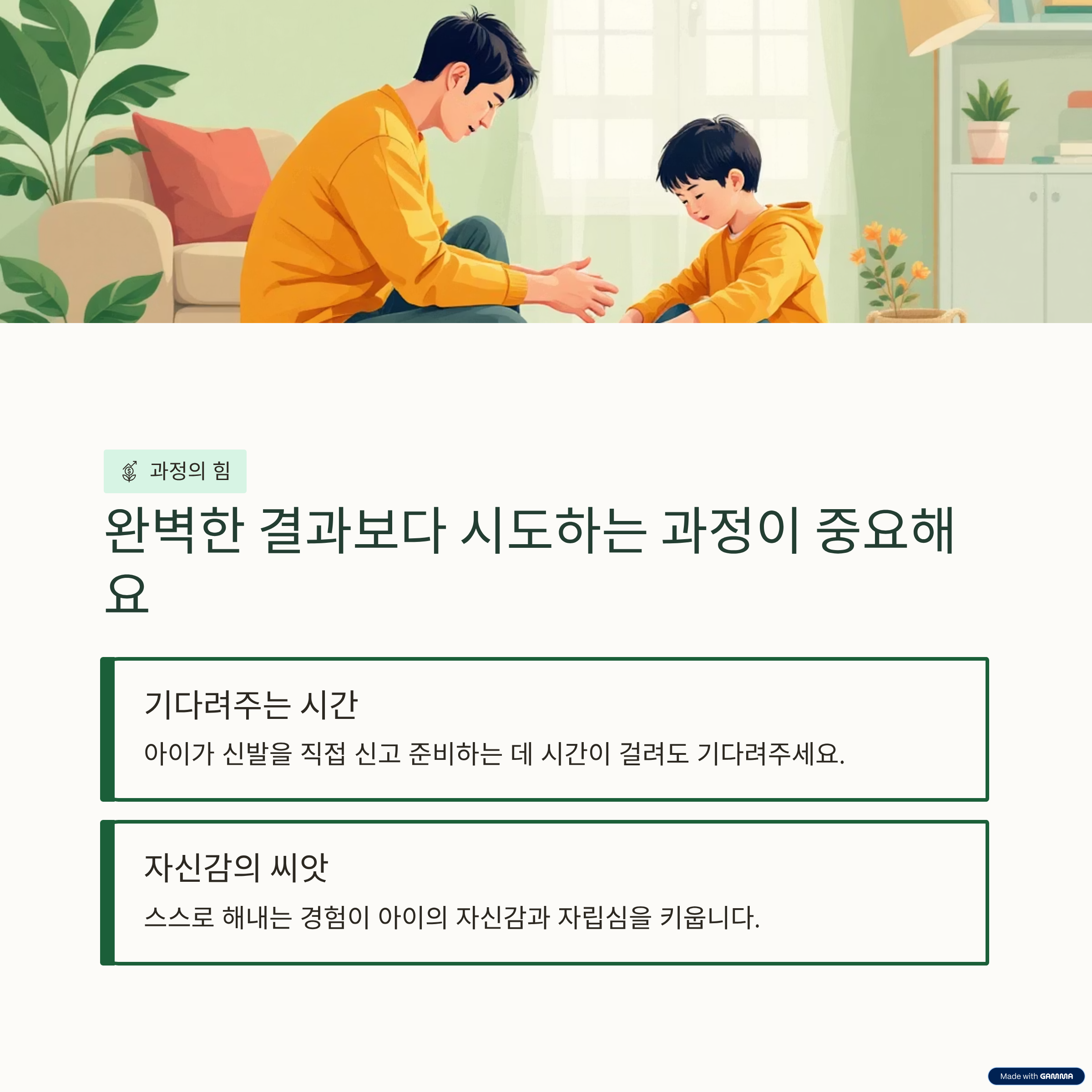 자립심은 타고나는 성격보다 반복된 경험에 더 큰 영향을 받습니다. 일상 속 작은 성공 경험이 자립심을 단단하게 만들어 줍니다.