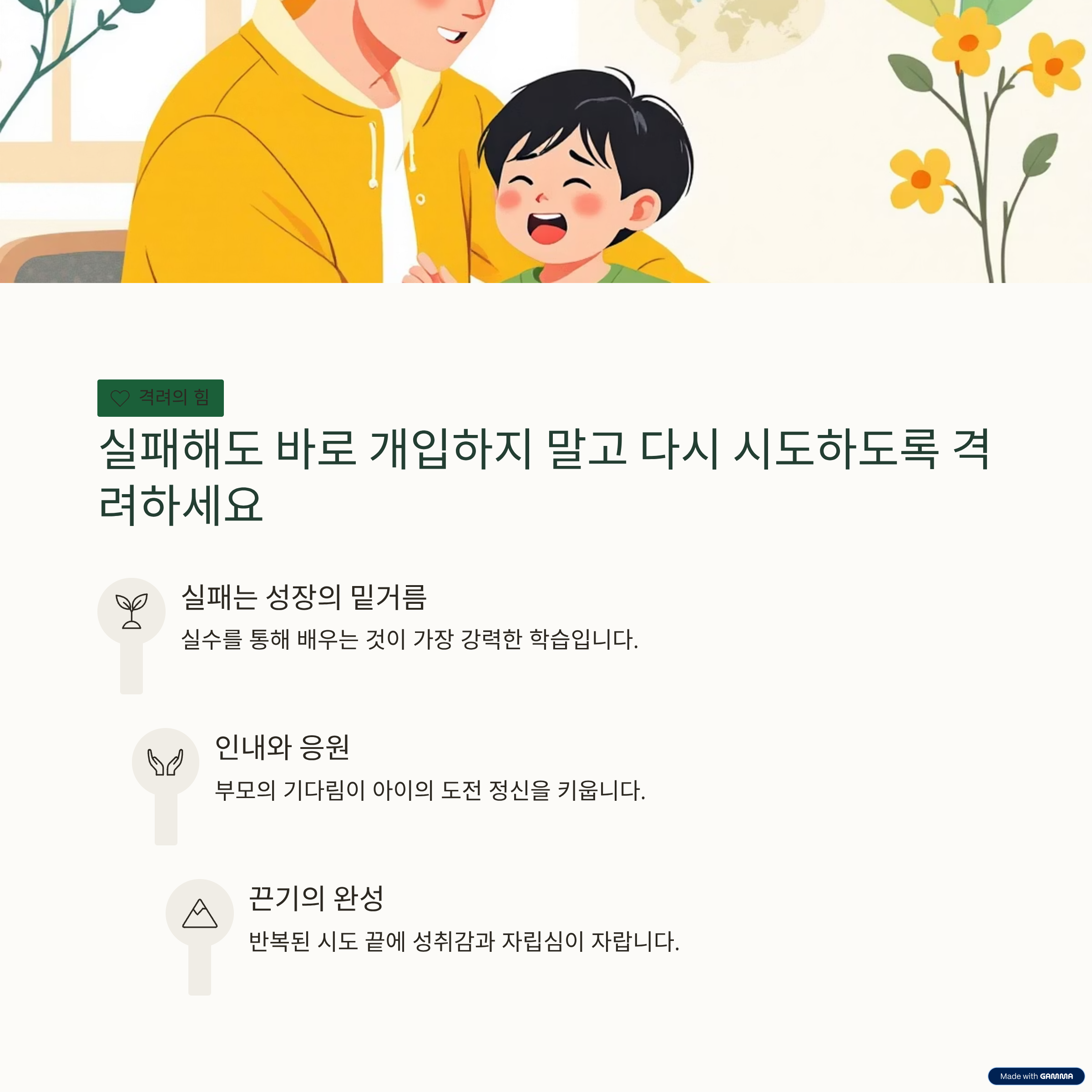 실패 경험 역시 자립심의 일부입니다. 바로 대신해 주기보다 다시 시도할 수 있도록 격려해 주는 것이 더 도움이 됩니다.