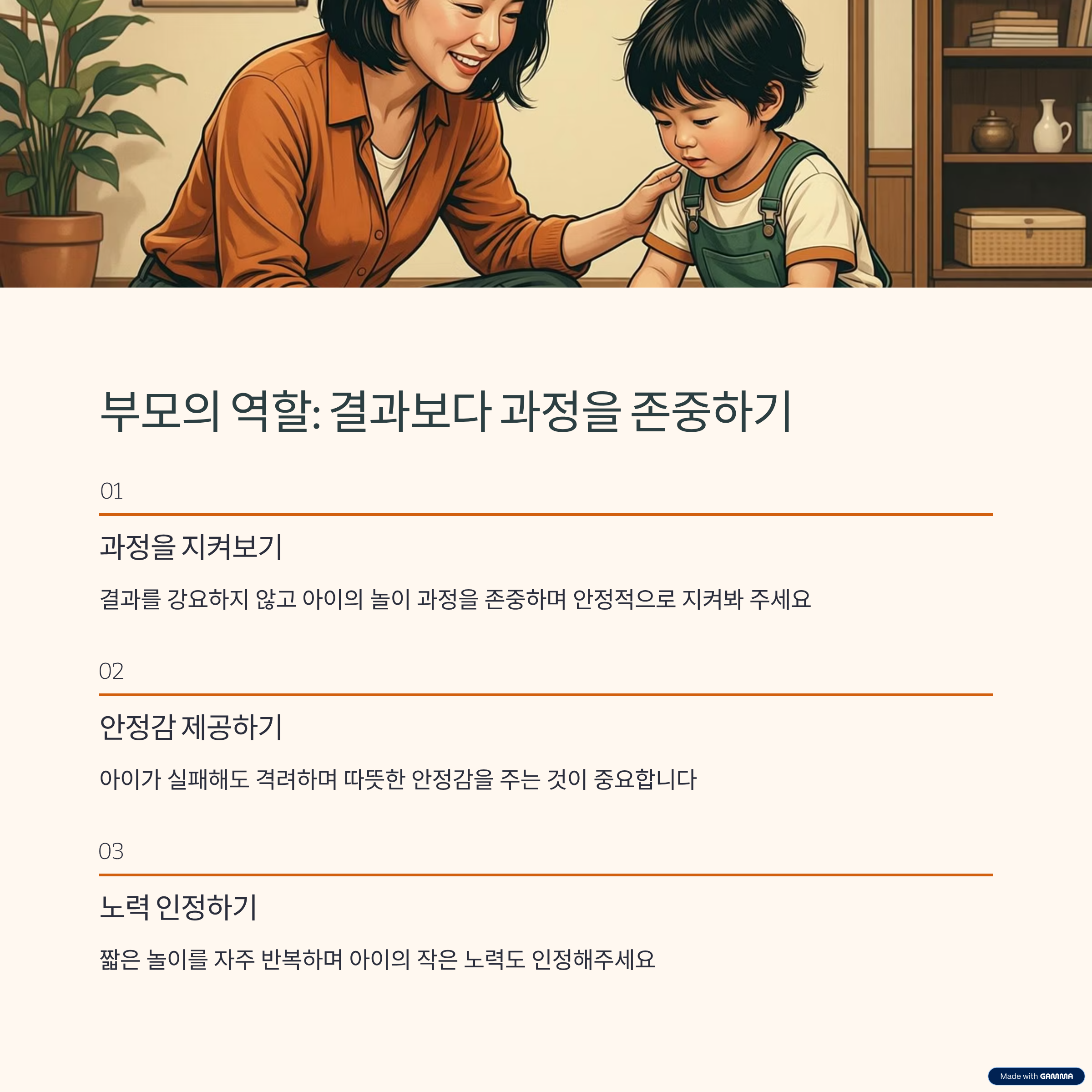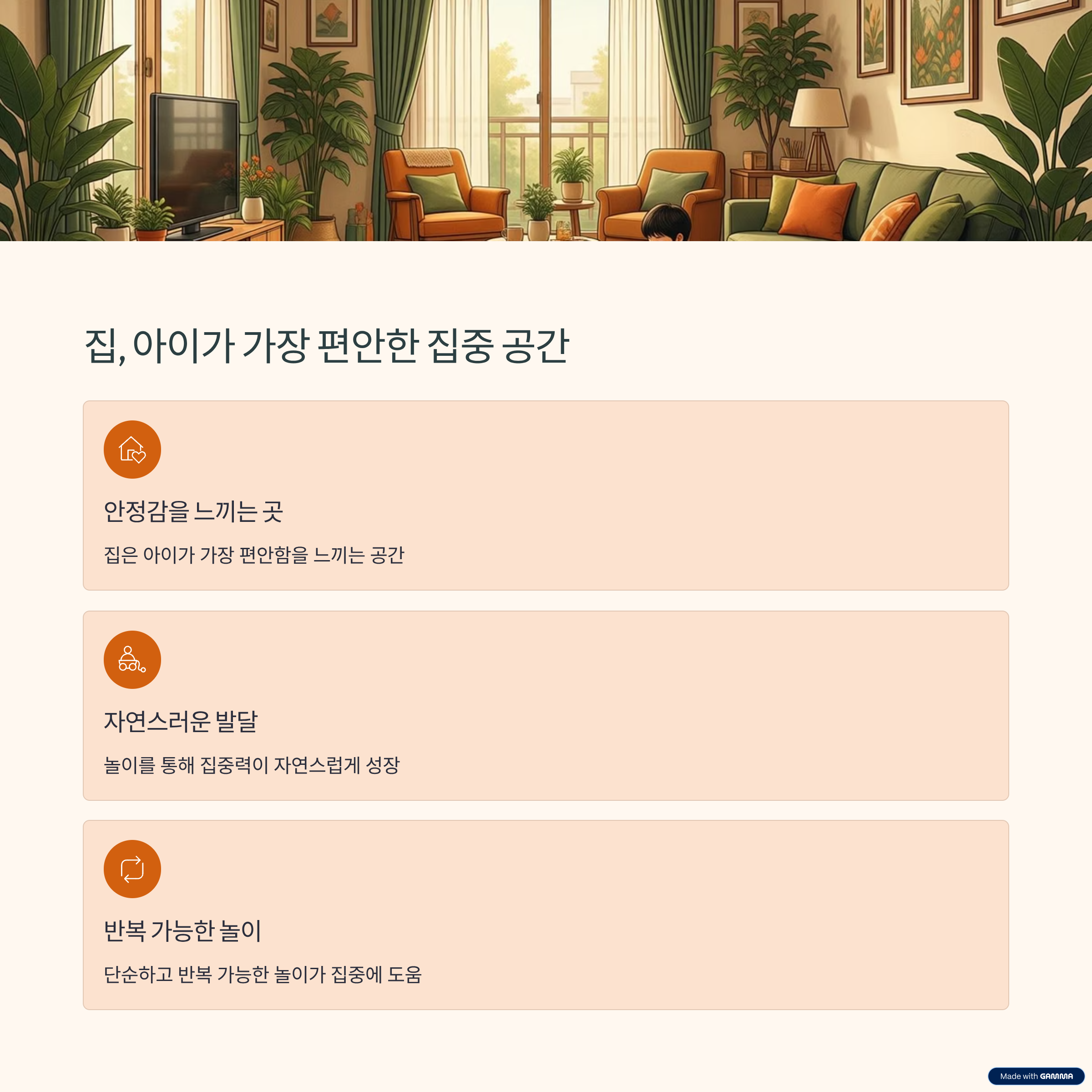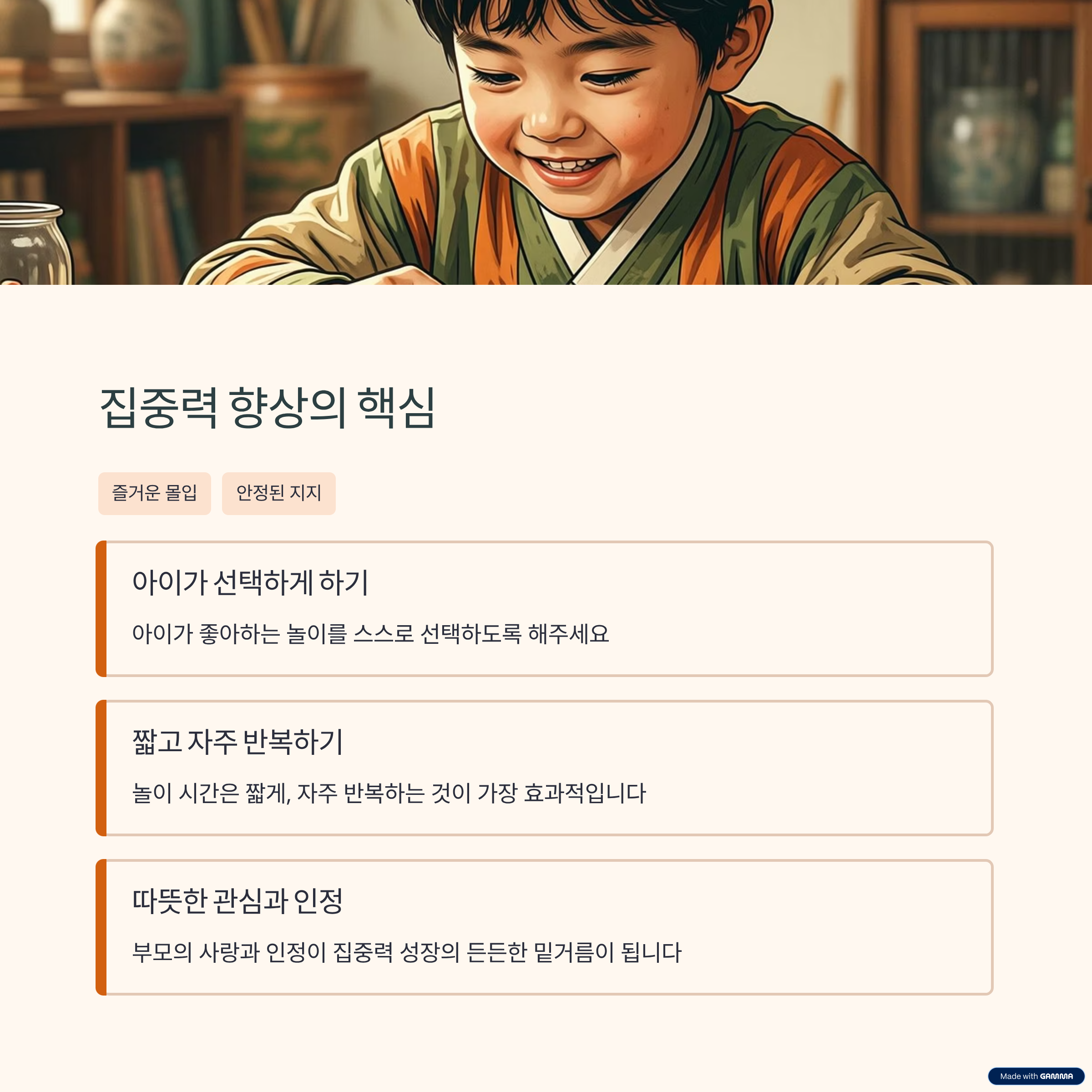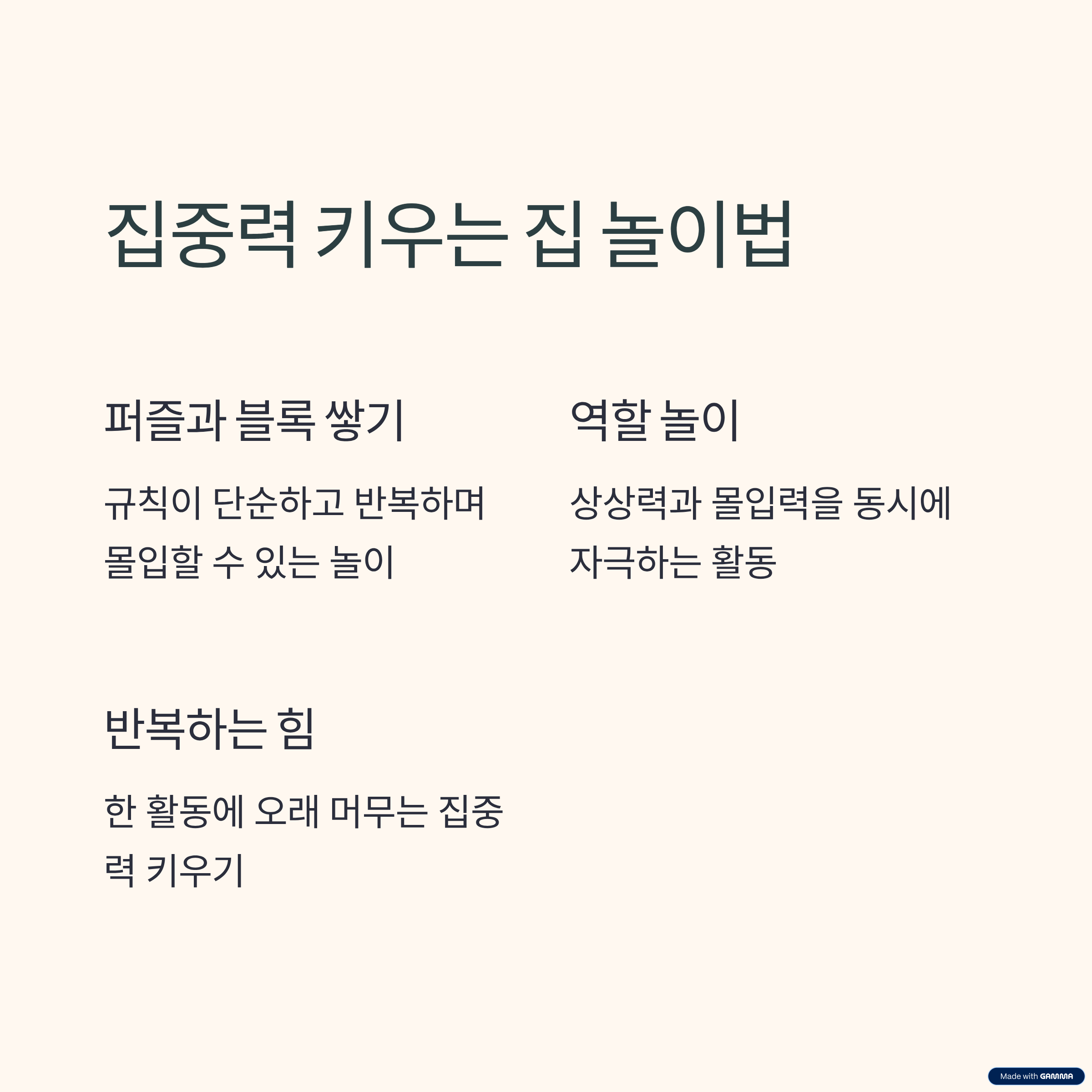 아이의 집중력은 훈련의 결과가 아니라 즐거운 몰입 경험이 쌓인 흔적입니다. 집이라는 가장 안전한 공간에서 아이의 속도에 맞춰 놀이를 이어가는 것만으로도 충분한 성장이 이루어질 수 있습니다. 오늘의 짧은 놀이 시간이 아이의 내일을 바꾸는 작은 씨앗이 될 수 있습니다.