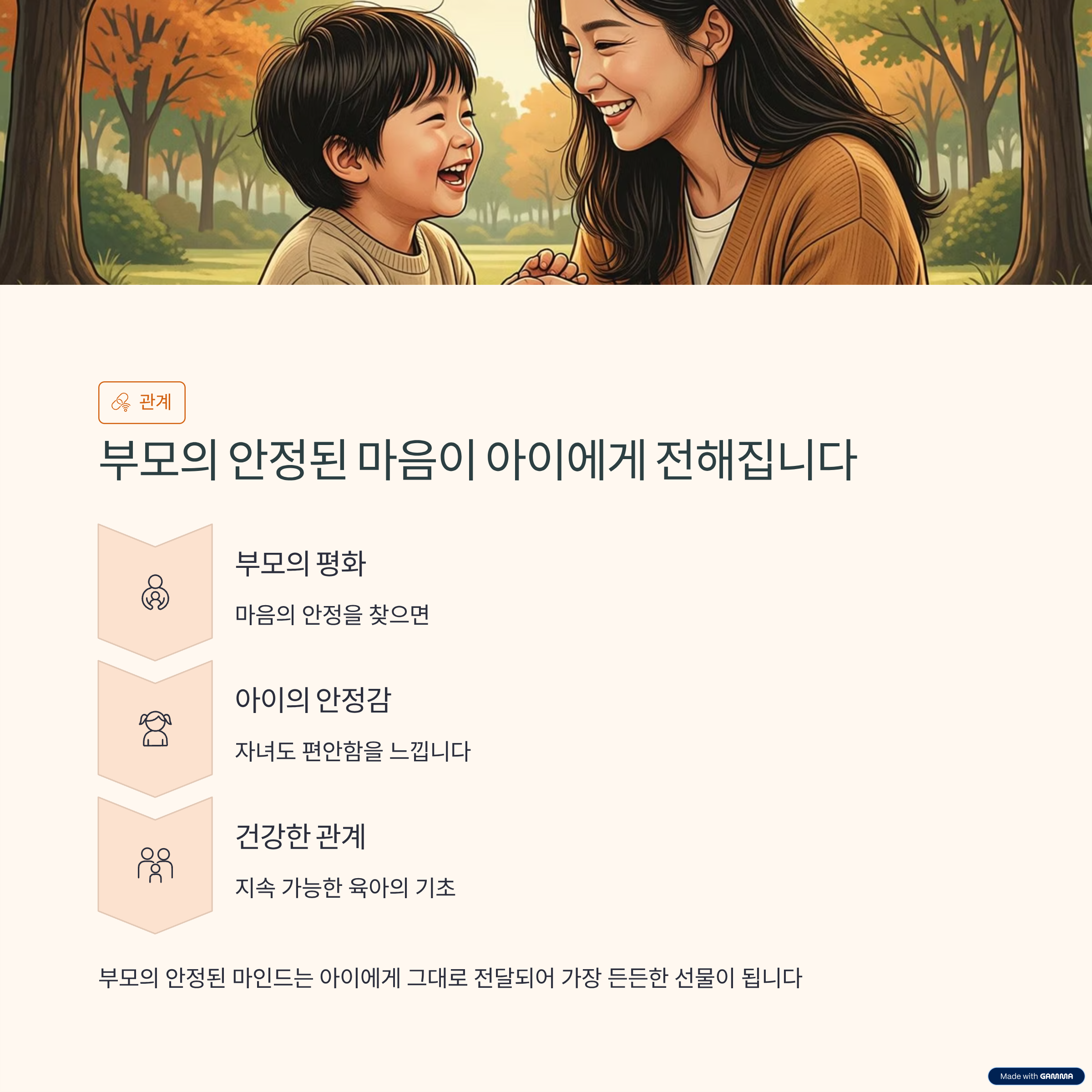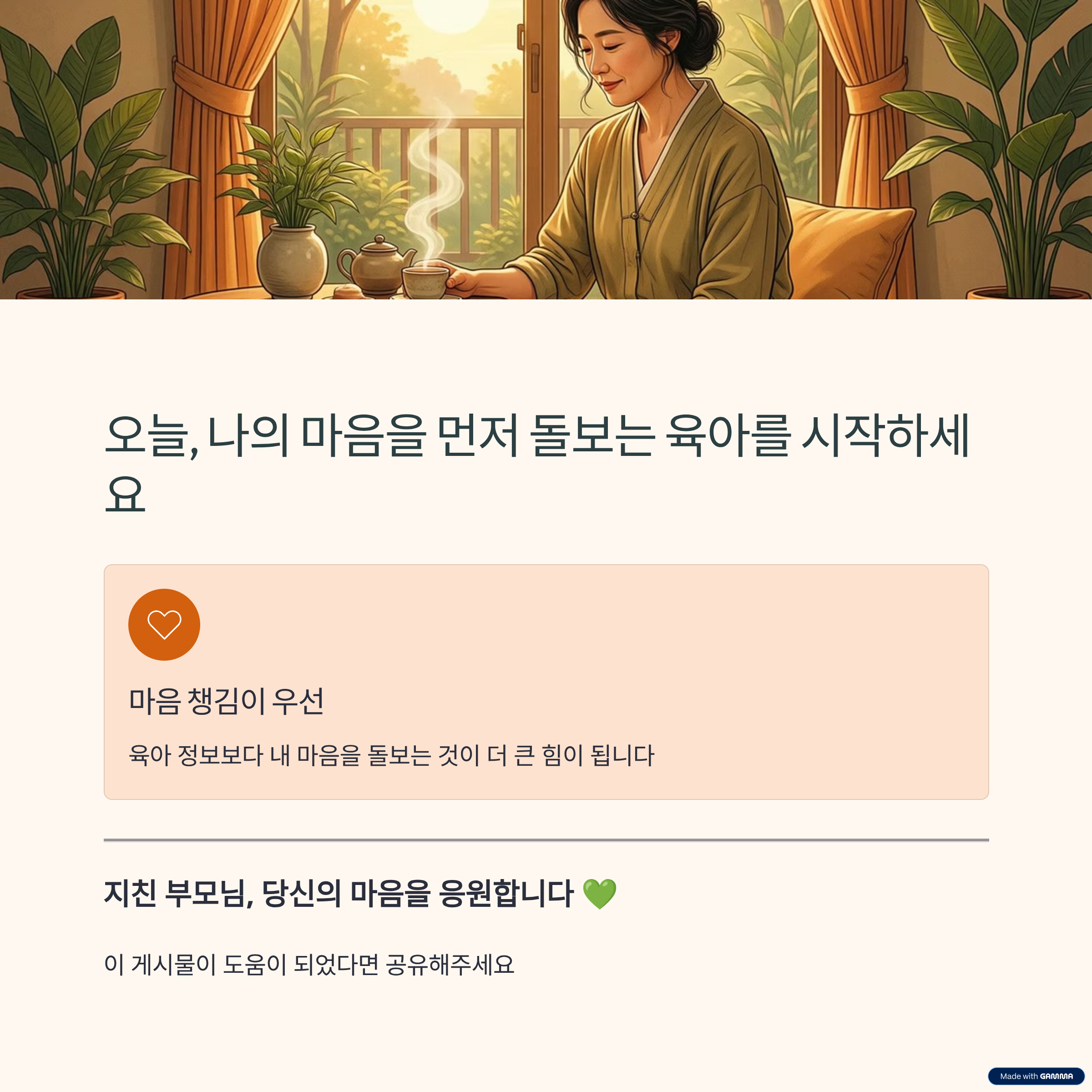 | 방치 시 부모 번아웃으로 이어질 수 있음 | 감정은 억제보다 이해가 중요함 | 작은 휴식과 인식의 반복이 핵심 |