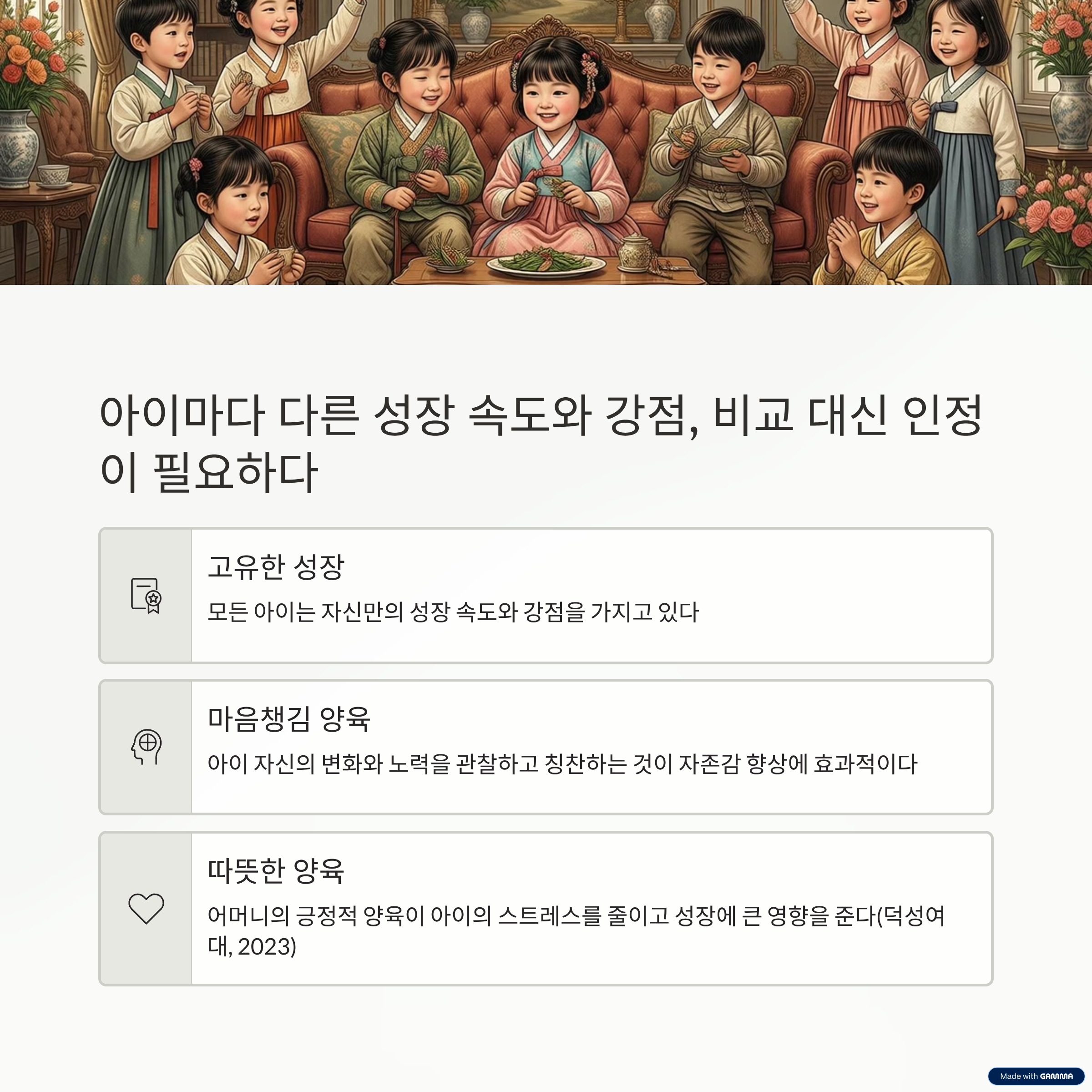 | 또래와의 비교 | 불안과 위축 | 개인의 속도 존중 |