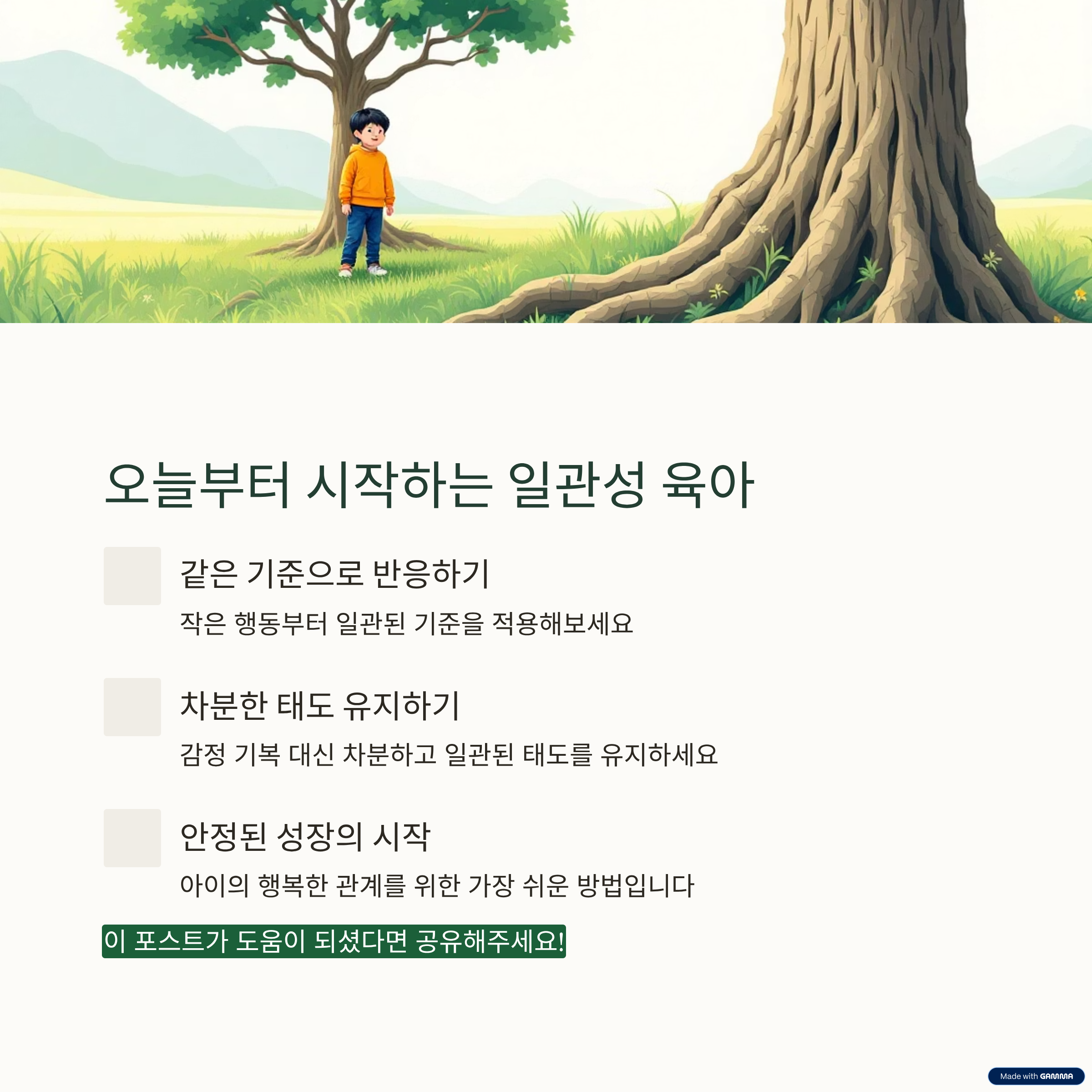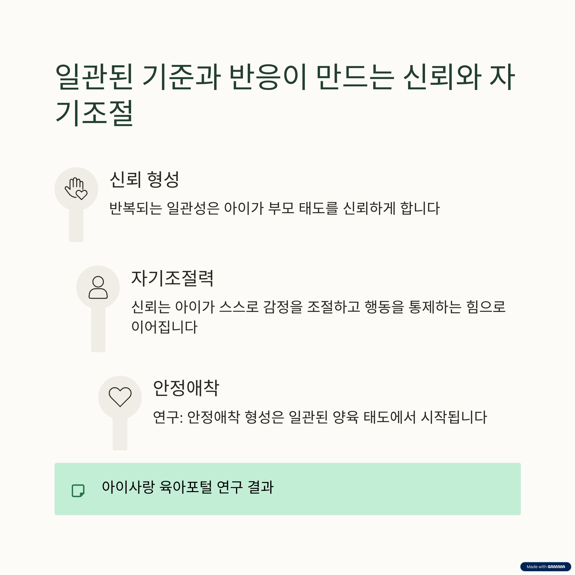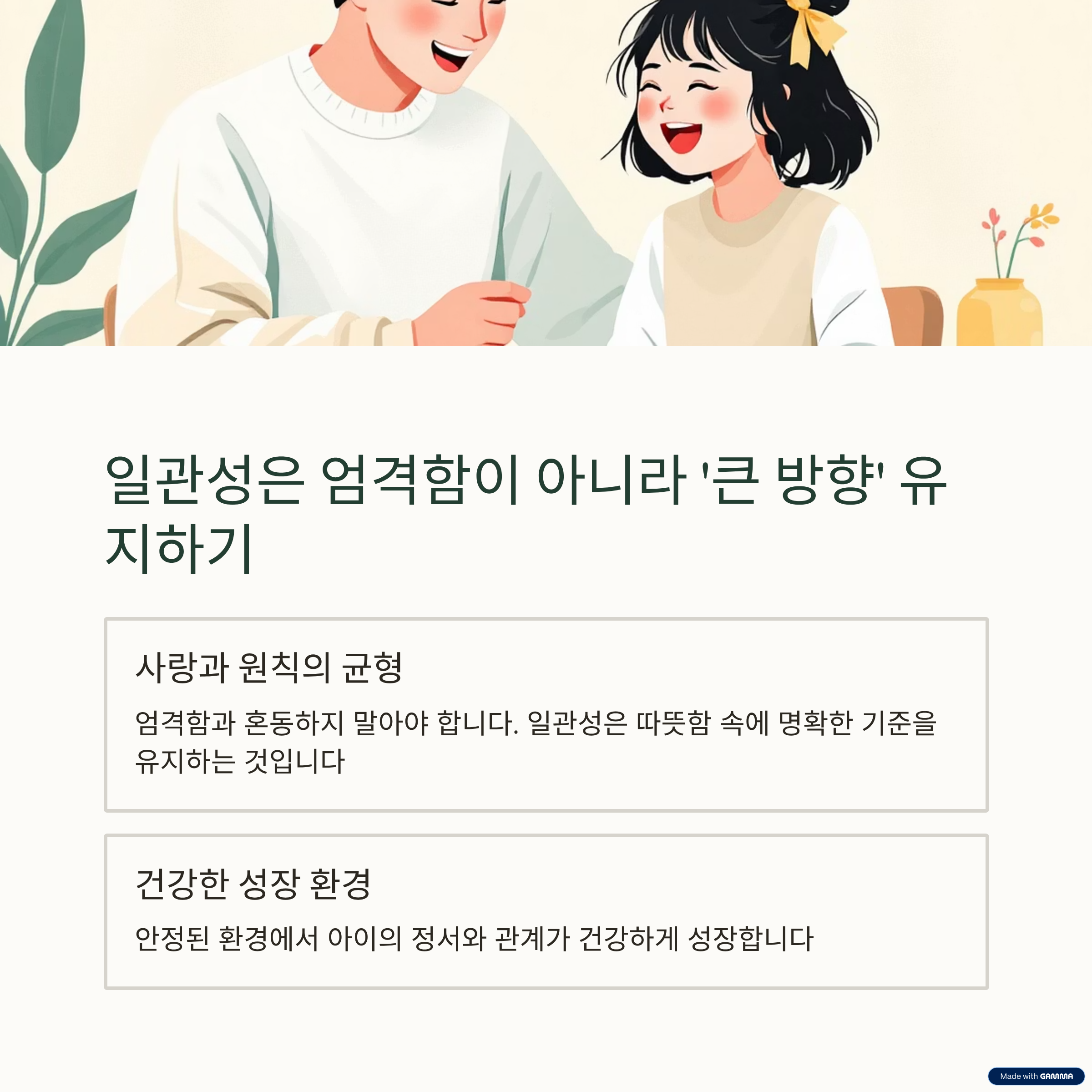 육아에서의 일관성은 완벽함을 요구하지 않습니다. 다만 큰 틀의 기준을 유지하려는 부모의 태도가 아이에게 신뢰와 안정감을 전달하게 됩니다.