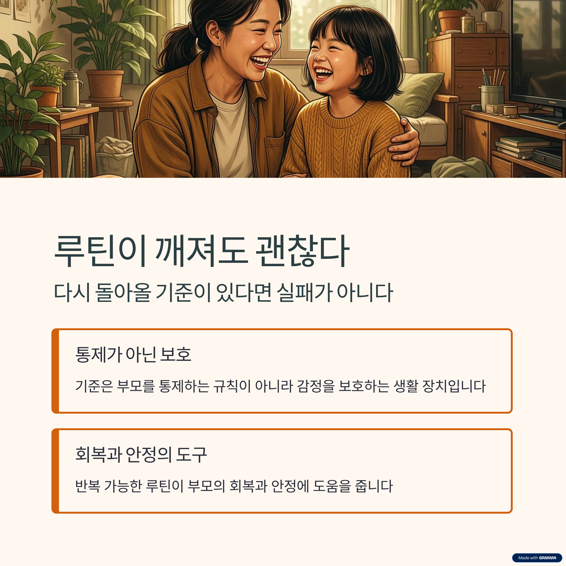 처음에는 부모 중심의 루틴으로 시작해도 충분히 의미가 있습니다. 부모의 감정이 안정되면 아이의 반응도 자연스럽게 달라집니다. 이후 아이의 참여를 천천히 넓혀가면 부담 없이 정착할 수 있습니다.