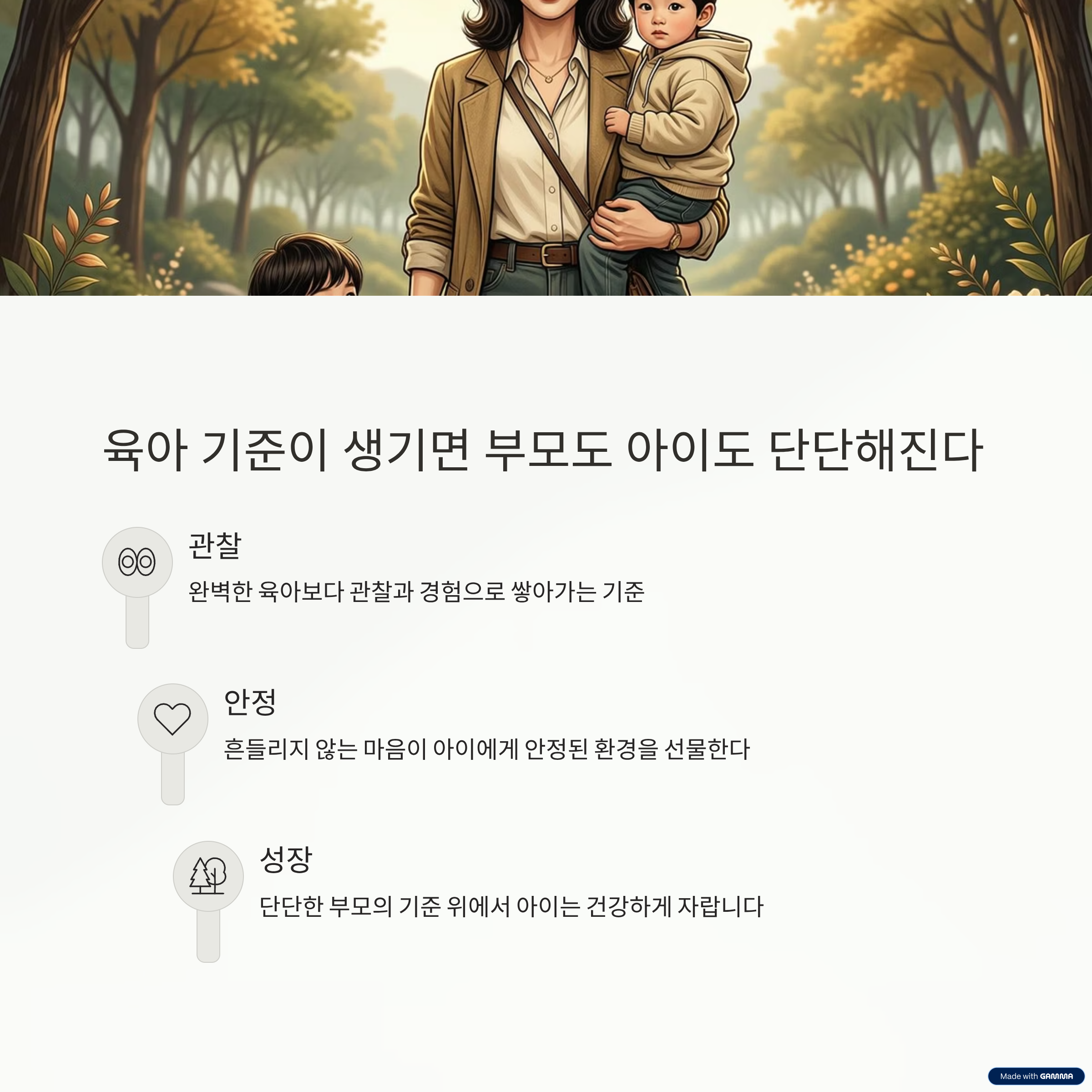 육아 기준은 거창할 필요가 없습니다. 우리 아이가 무엇에 민감한지 부모가 무엇을 중요하게 생각하는지 스스로에게 질문하는 것에서 시작됩니다. 이렇게 쌓인 기준은 시간이 지날수록 부모를 단단하게 만들어 줍니다.