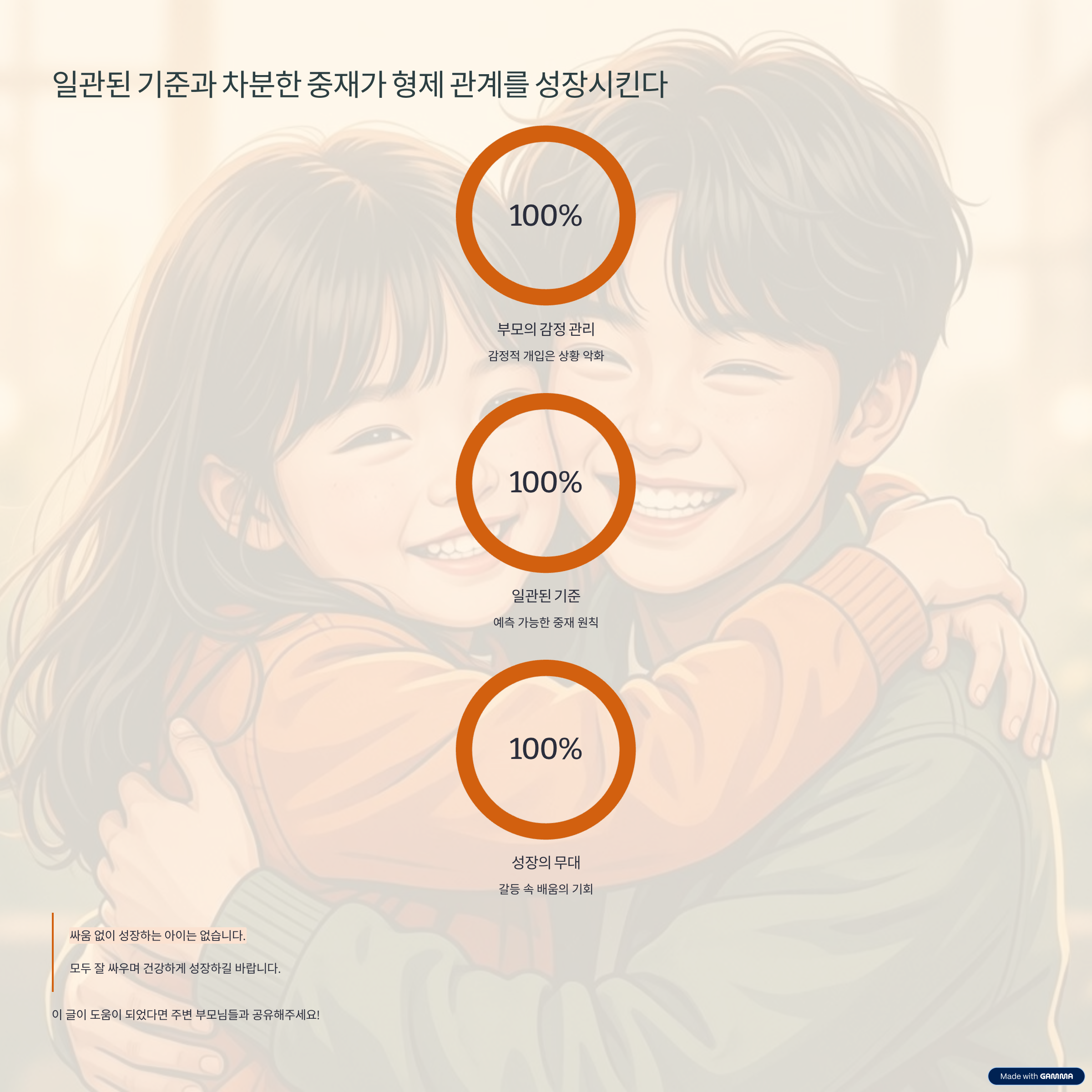 형제 자매의 갈등은 부모를 힘들게 만드는 문제이지만 동시에 중요한 성장의 기회이기도 합니다. 부모가 감정적으로 흔들리지 않고 일관된 기준으로 중재할 때 아이들은 갈등을 통해 관계를 조율하는 방법을 배웁니다. 오늘의 중재 경험은 아이들이 앞으로 만날 수많은 인간관계의 기초가 될 수 있습니다.